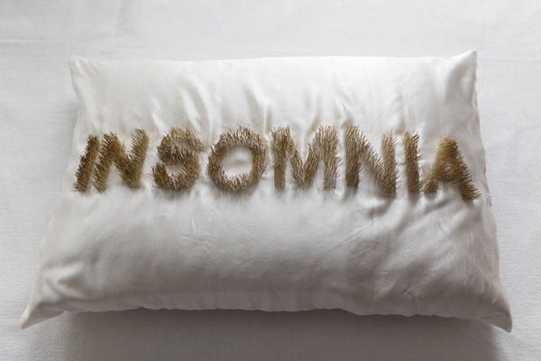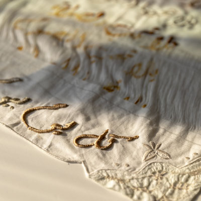 The emergency blankets were hand-cut into stripes and then hand woven into an antique pillow to form the pattern of the waves. The hand embroidery dates from the beginning of the 19th century before all those tragic events in the sea, and it means "Rest well".