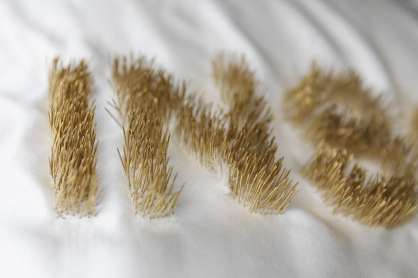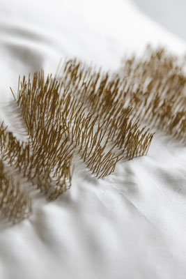 In this textile work I deconstructed the wire, coloured it with gold and weaved it with the most delicate mohair wool. This technique is inspired by “Ikat”, however instead of dyeing a part of the wrap to form the design I inserted the golden part of the barbed wire in the welt. The result is chaotic as the urban planning in Beirut.
